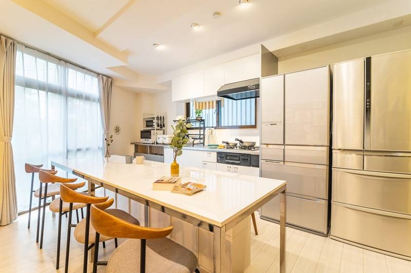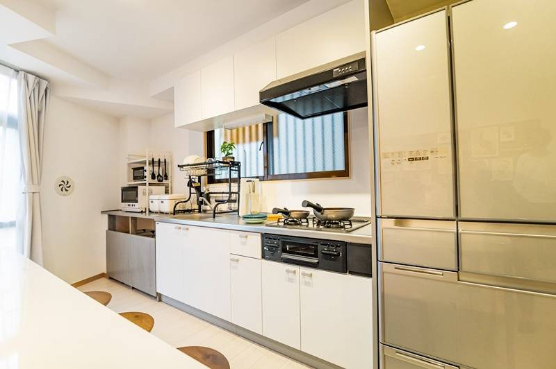 | キッチン | ガスコンロ、調理器具、食器、収納、冷蔵庫、炊飯器、オーブンレンジ |