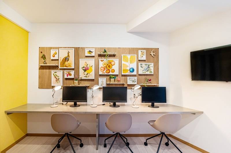 ワークスペースは便利なモニター付き。全部屋家具付き個室で、スーツケースだけですぐ入居可能!さらにうれしい宅配ボックス、個別ポストも完備。