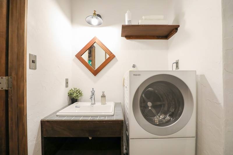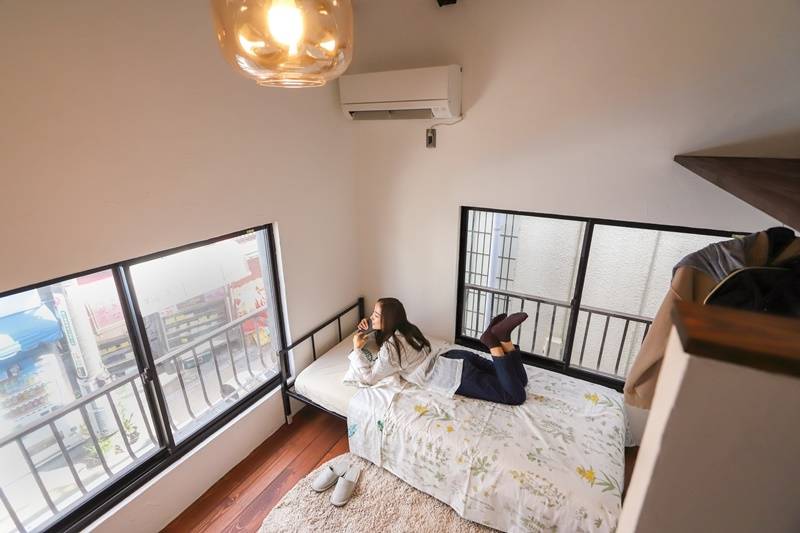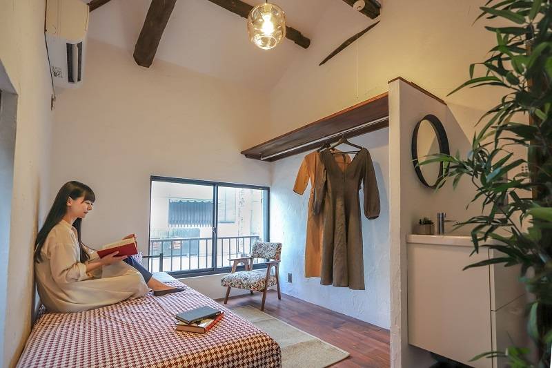 2階は天井が抜かれており、天高は約4m!どの部屋も小ぶりなサイズですが、実際の面積よりも広く感じます。基本的に内装は同じで、写真の家具等はつかずベッドのフレームのみの用意です。梁の位置によって家具のレイアウトも変わってくると思うので、好みの部屋を選んでいただけたら。また各部屋に洗面がついていて、女性にうれしい配慮がされています。