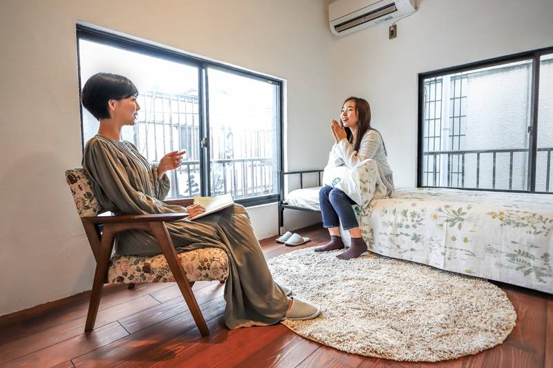 玄関を入ると1階に共用のリビングと水回り、2階に個室が計5部屋という間取り。共用スペースと専有部が階によって分けられているので、プライベートのスペースがきちんと確保されています。