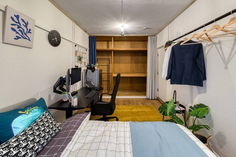 4~5部屋ごとのユニットになっています(女性専用エリアあり)。中には洗濯機、シャワー、洗面台、ベランダ、シンクがあるので使い勝手は抜群◎部屋には机、椅子、エアコン、ベッド、冷蔵庫、収納器具など家具家電を揃えています。リモートワーカー向けの機材を揃えたハイグレードルームや大型収納がある部屋もあります。お手頃にかつ、外国人と交流したい方には国際交流ドミトリーのお部屋がおすすめ♪日本と外国の方が半分ずつ入居するので、毎日顔を合わせてお互いの言語を学ぶことができます。