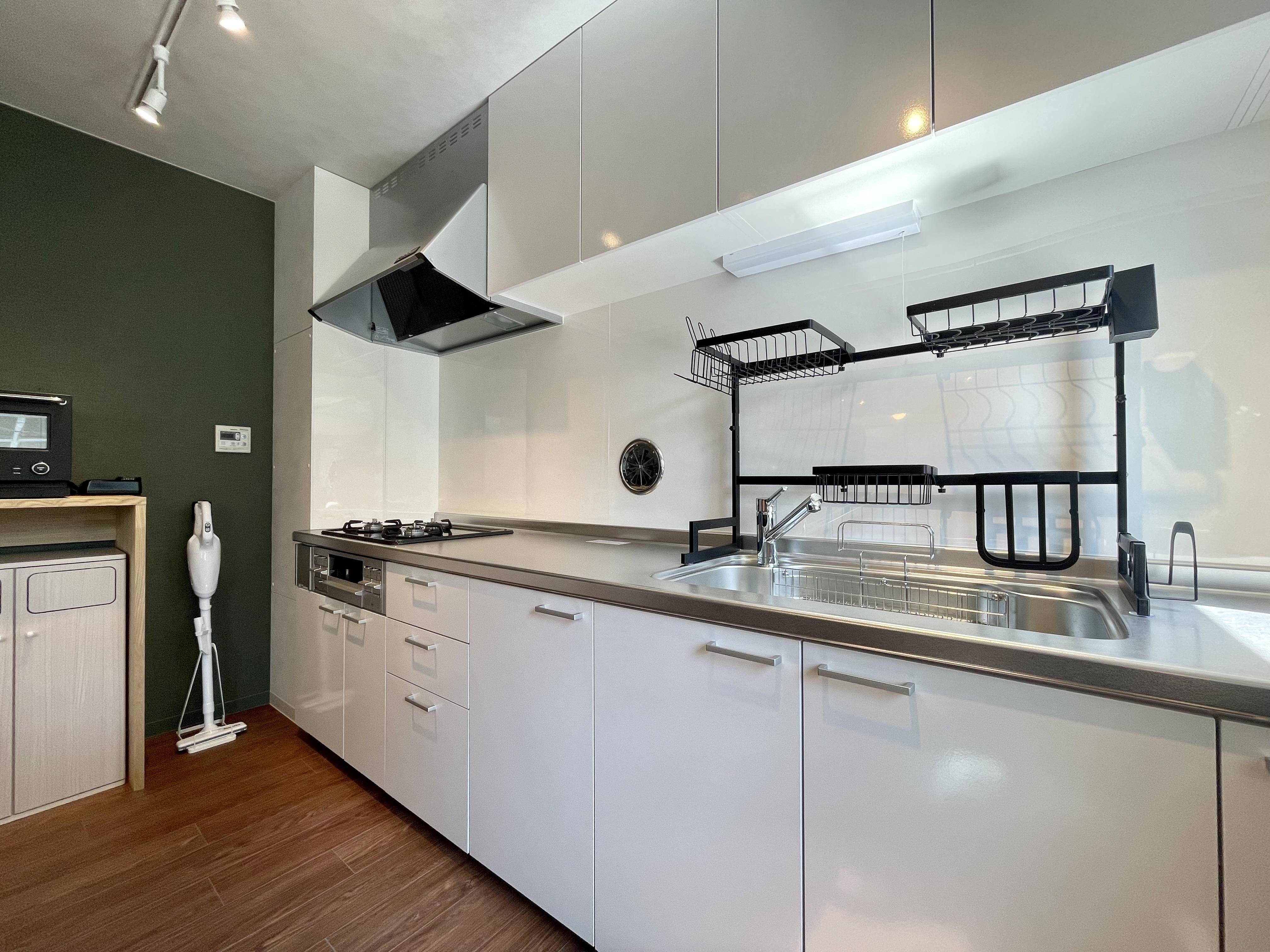 | キッチン | 3口ガスコンロ、魚グリル、調理器具、収納、食器、炊飯器、オーブンレンジ、トースター |