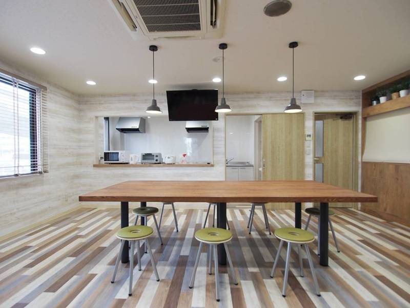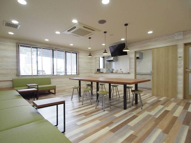 共有スペースには、大きなダイニングテーブル&チェアとソファがあり、ほっと安らぐ空間です。ひとりで作業するのもいいですが、テレビもあるので入居者同士でスポーツやドラマなど見るのも楽しそう♪