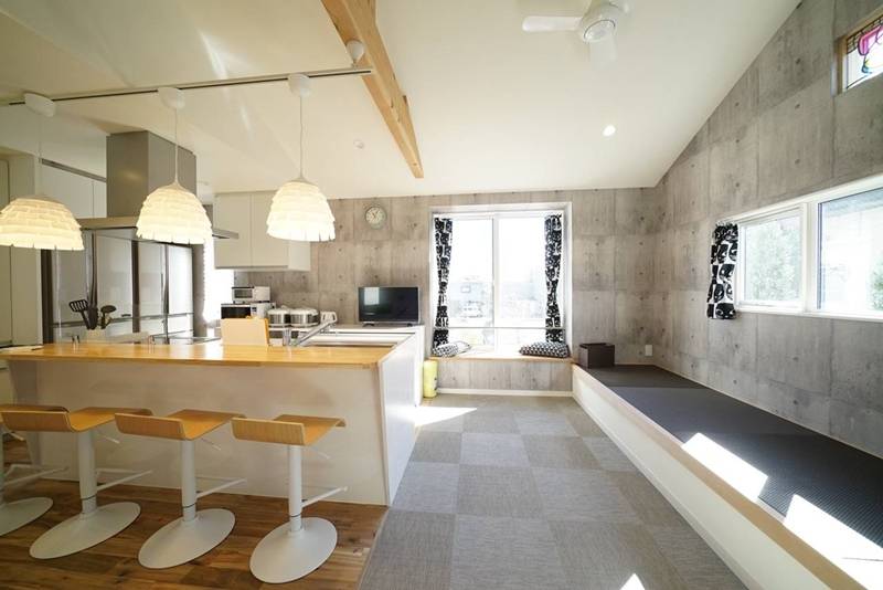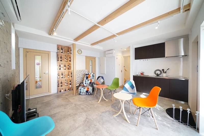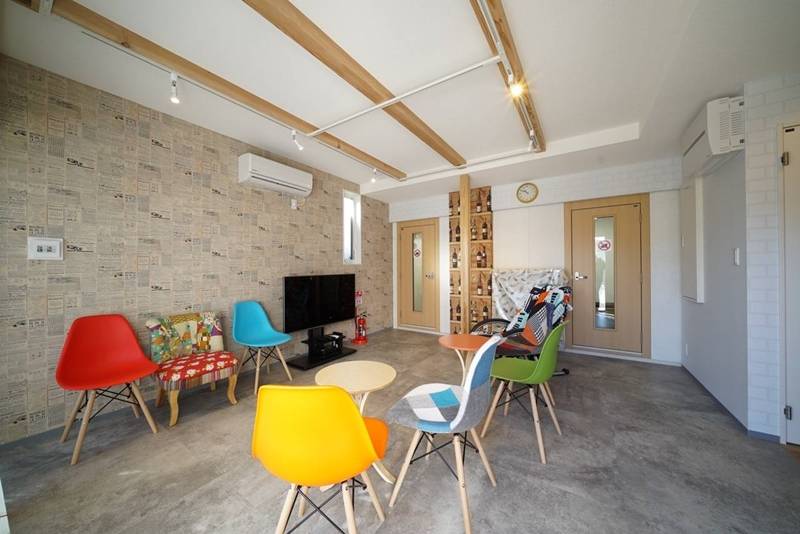 シンプルなコンクリート調のフローリングに、アクセントのあるカラフルな椅子や、遊び心あるインテリアにもご注目ください!