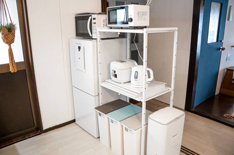 | キッチン | 二口コンロ(グリル付き)、冷蔵庫、食器調理器具類、電子レンジ、トースター、ケトル、炊飯器、各自収納付き |