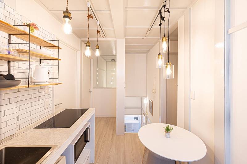 白を基調としたハウス内には、キッチン、乾燥機、洗濯機、シャワールームがそれぞれ、2つずつ設けており、水回りが充実しているので、混雑しがちな朝の時間帯も安心してお過ごしいただけます。 全室鍵付き完全個室で、一部の部屋には、室内に洗面台も設置。部屋もゆったりした設計になっており、快適にお過ごしいただけます。