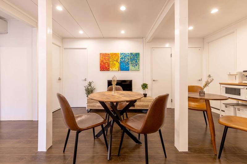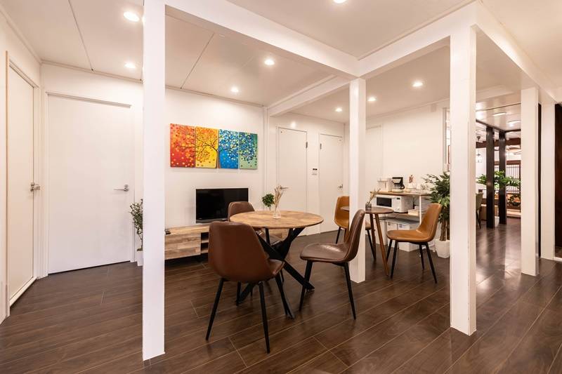 白を基調としたハウス内には、キッチン、乾燥機、洗濯機、浴室・シャワールームがそれぞれ、3つずつ設けており、水回りが充実しているので、混雑しがちな朝の時間帯も安心してお過ごしいただけます。 全室鍵付き完全個室で、室内に洗面台も設置の部屋もあります。部屋もゆったりした設計になっており、快適にお過ごしいただけます。和モダン風のビンテージなお部屋もいくつかご用意していますので、ぜひご自身にぴったりのお部屋を見つけてください。