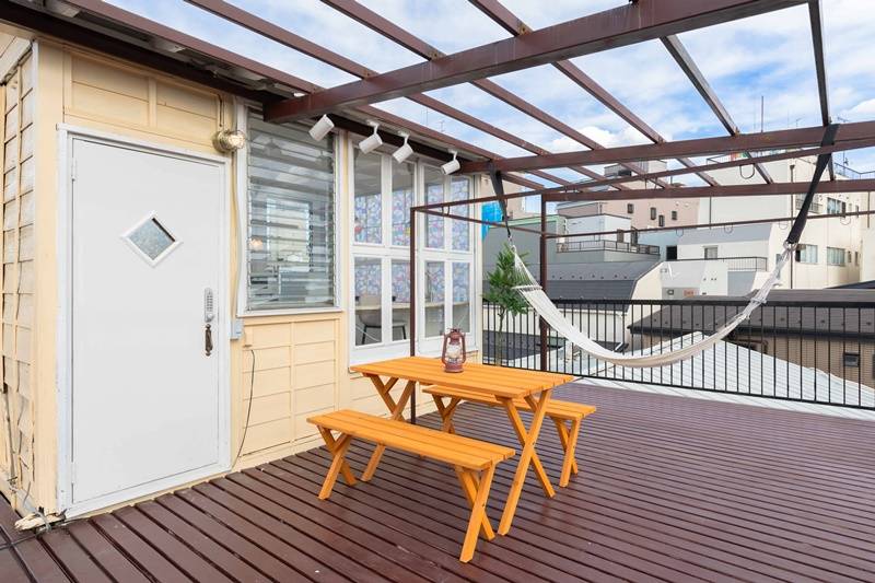 3階の屋上には、テラスがあり、洗濯機2台、乾燥機2台のほか、ミニキッチン、ハンモック・ベンチシート、お布団を干せるスペースもあります。洗濯機を回している間少しテラスで一息、なんて自分なりの多彩な利用が可能です。