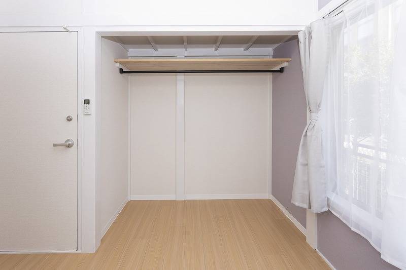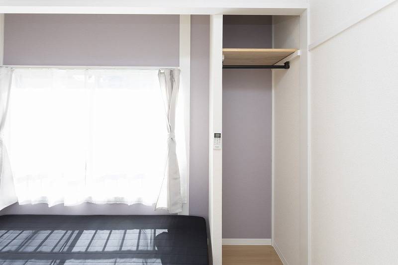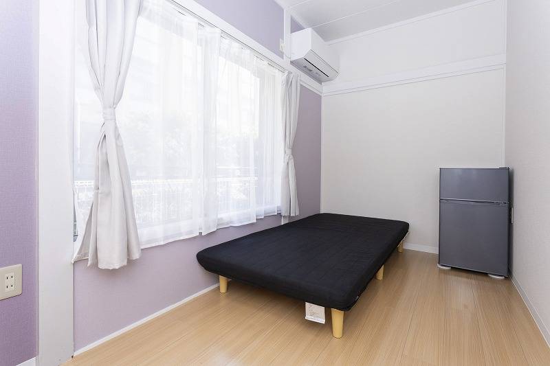 ベッド、エアコン、机、椅子、冷蔵庫、電源、クローゼット、洗濯物干し、等。