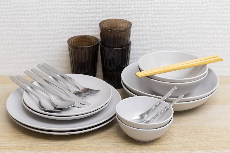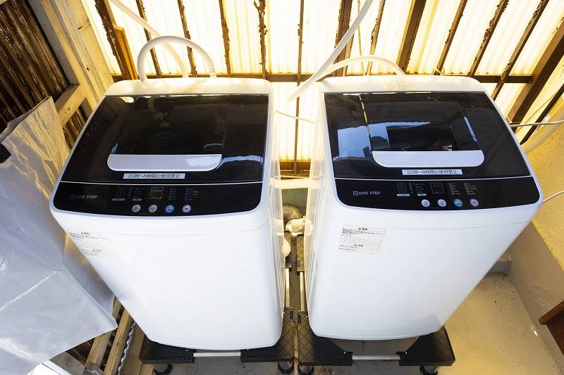 3つ口ビルトインコンロ、電子レンジ、炊飯器2つ、オーブントースター、電気ケトル、食器各種、シャワールーム2つ、リビング器具一式、温水便座付きトイレ2つ、洗濯機2つ、洗面台1つ等