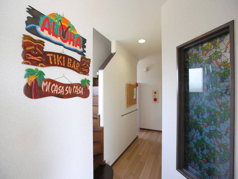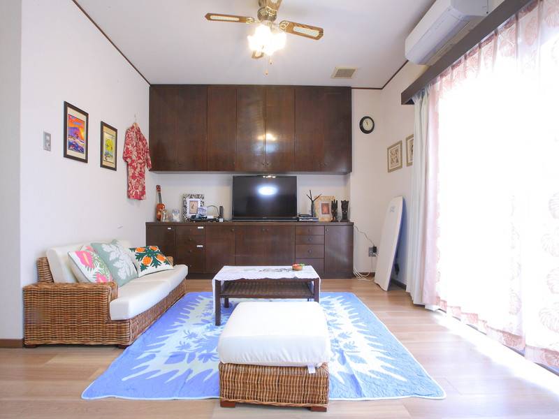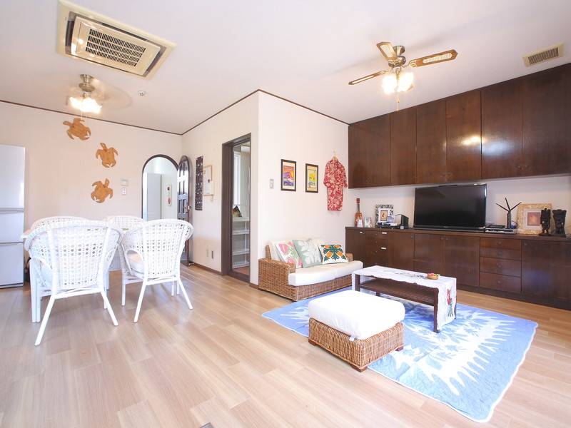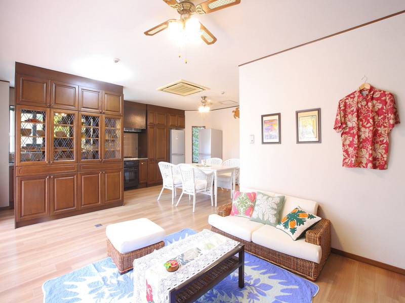 ハウスのデザインテーマは「ハワイアン」で、白いテーブルや籐のチェア、ソファなどが配置されたリビングはリゾート感溢れる雰囲気です。