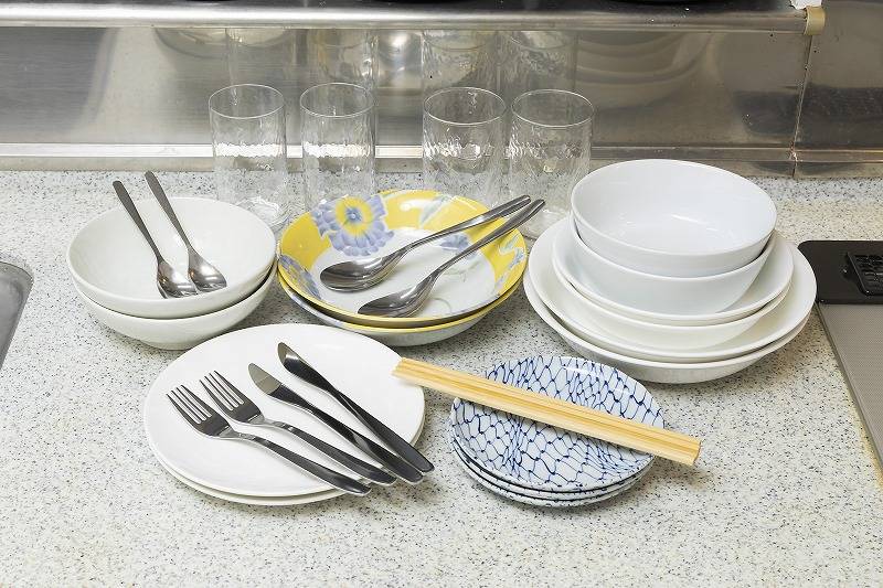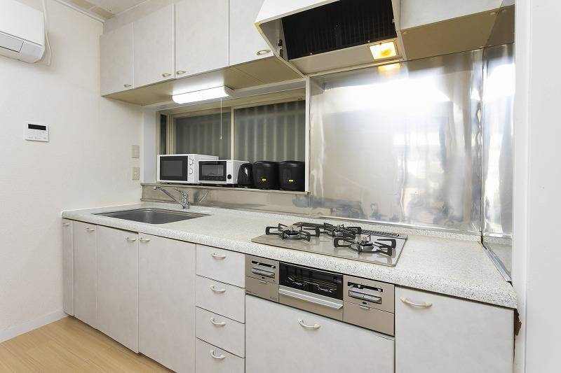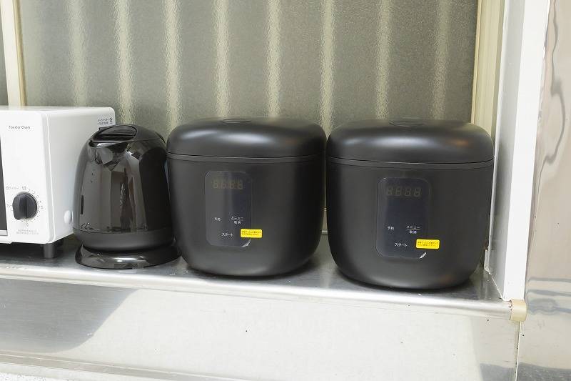 | キッチン | 3つ口ビルトインコンロ、電子レンジ、炊飯器2つ、オーブントースター、電気ケトル、食器各種 |