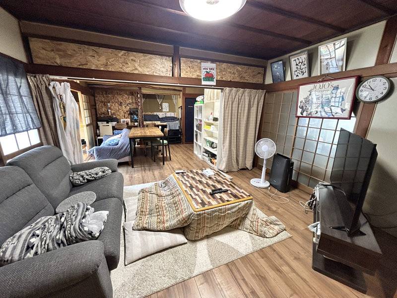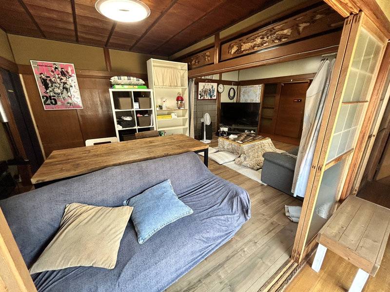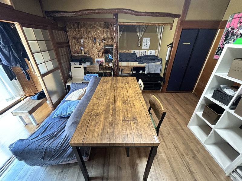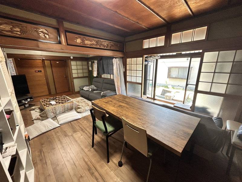10部屋ある大きな日本家屋。現在改装中で、部屋同士をつなげながら、風通しがよくて開放感のある住まいに生まれ変わっています。13畳のリビングを中心に、6帖や8帖、5帖の個室があり、庭に面した10帖の離れの部屋も。離れにはキッチンもあるので、少しプライベート感を大切にしたい人にもおすすめです。