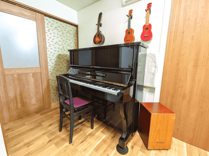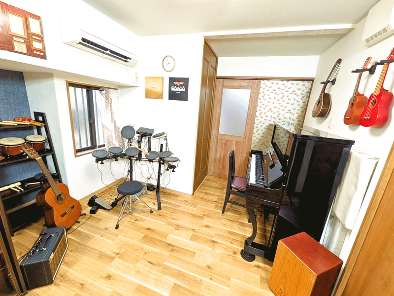 | リビング | テーブル1、テレビ1、アップライトピアノ1、電子ドラム(Roland)1、その他ウクレレやカホン等のアコースティック楽器 |