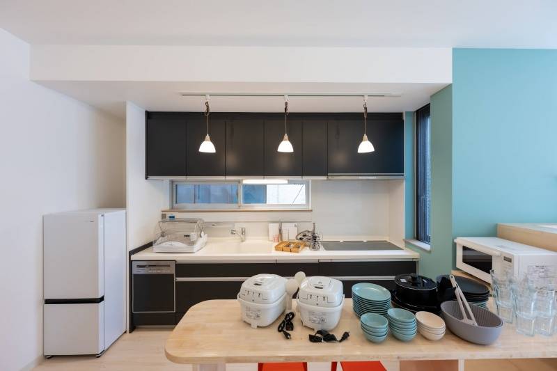 共用部には電子レンジや炊飯器、調理器具、食器など生活に必要な用具が一通りそろっています。
