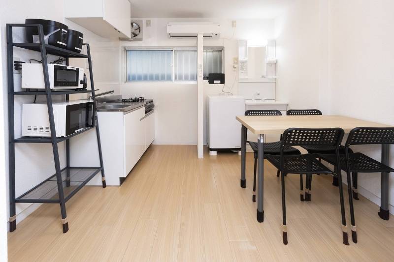 コンロ、電子レンジ、オーブントースター、炊飯器2台、食器各種、シャワールーム1室、洋式トイレ(温水便座付き)1室、洗濯機1台