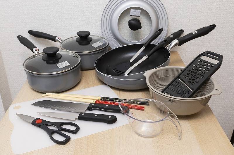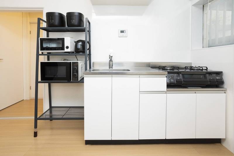 | キッチン | 電子レンジ、オーブントースター、炊飯器、電気ケトル、調理道具、食器一式 |