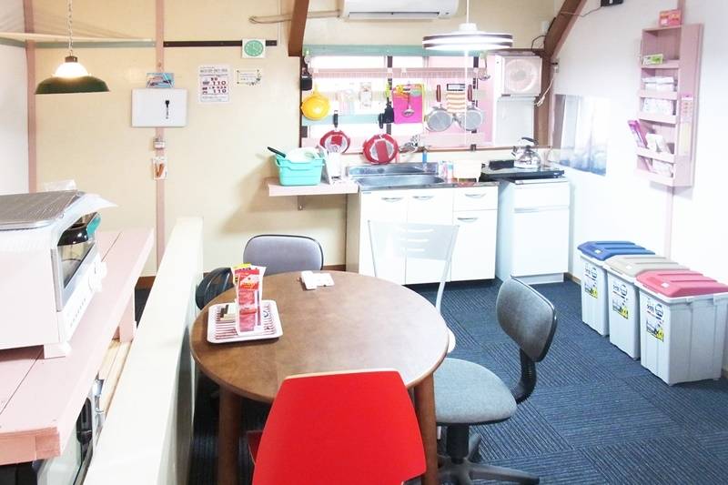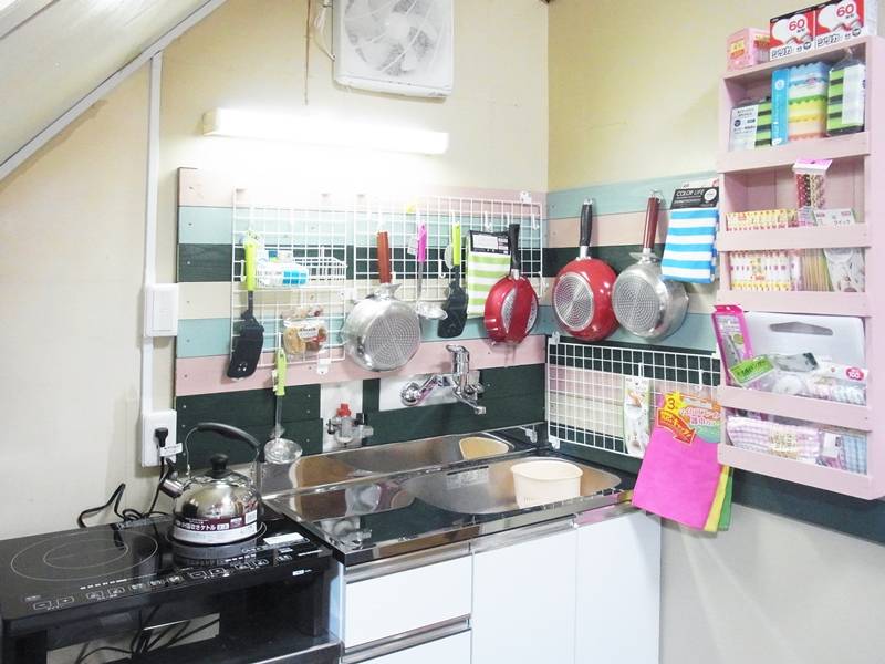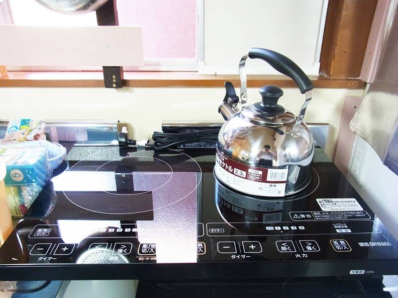 | キッチン | テーブル、イス、IHヒーター、電子レンジ、オーブントースター、電気ケトル、調理器具 |
