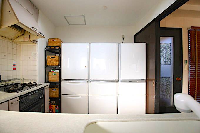 | キッチン | 3口ガスコンロ1、オーブンレンジ2、オーブントースター1、炊飯器3、冷蔵庫3、電気ケトル1、調理器具、食器、カトラリー |