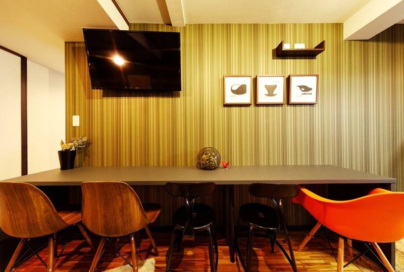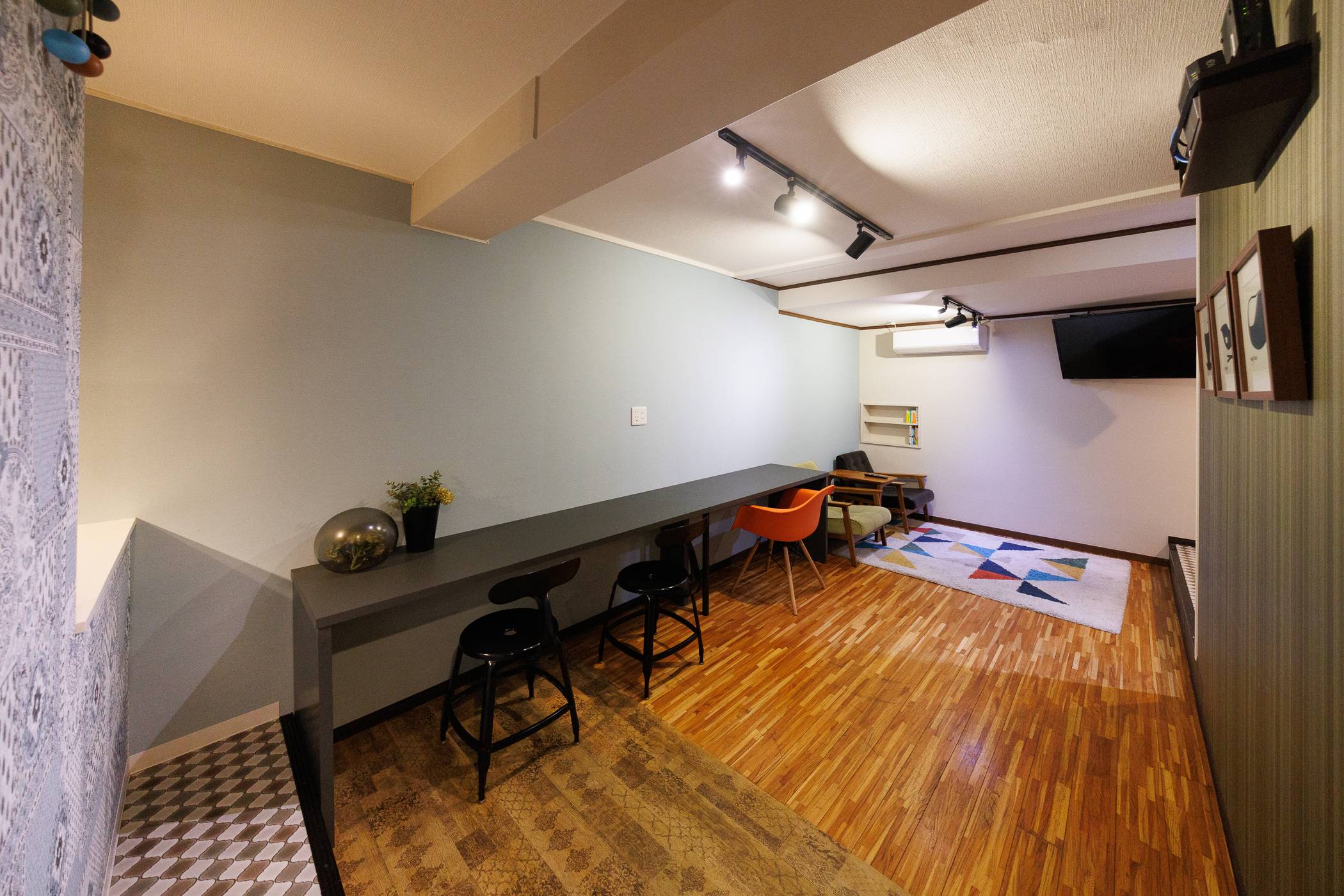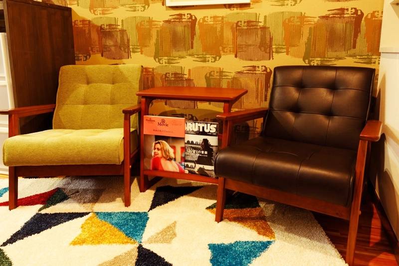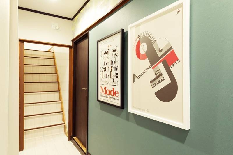 入り口はちょっとわかりにくいですが、玄関を開けて階段を上がると、ミッドセンチュリーなデザイン家具が揃った快適な空間になっています。