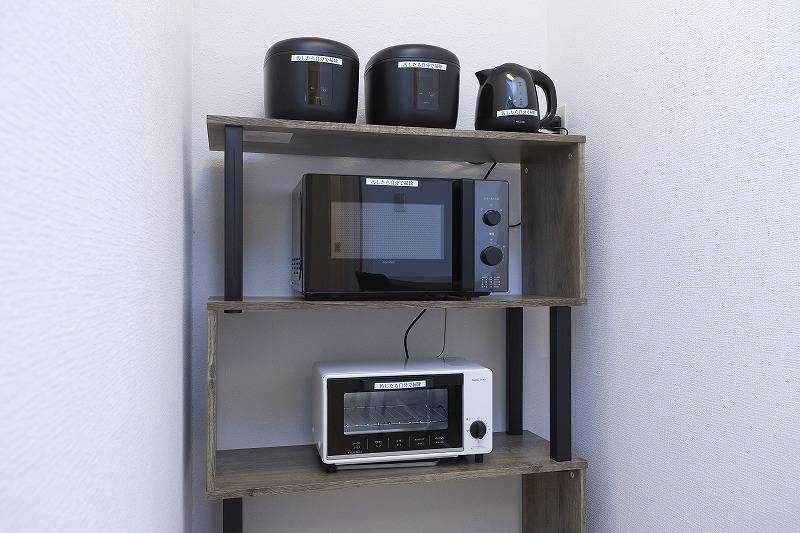 | キッチン | コンロ、電子レンジ、オーブントースター、炊飯器2つ、電気ケトル、調理道具、食器一式 |