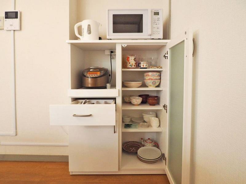 | キッチン | 3口ガスコンロ、電子レンジ、トースター、炊飯器、電子ケトル、鍋、フライパン、ピーラー、おたま、ターナー、ボール、ザル、土鍋、栓抜き、缶切り、計量カップなどなんでも揃っています |
